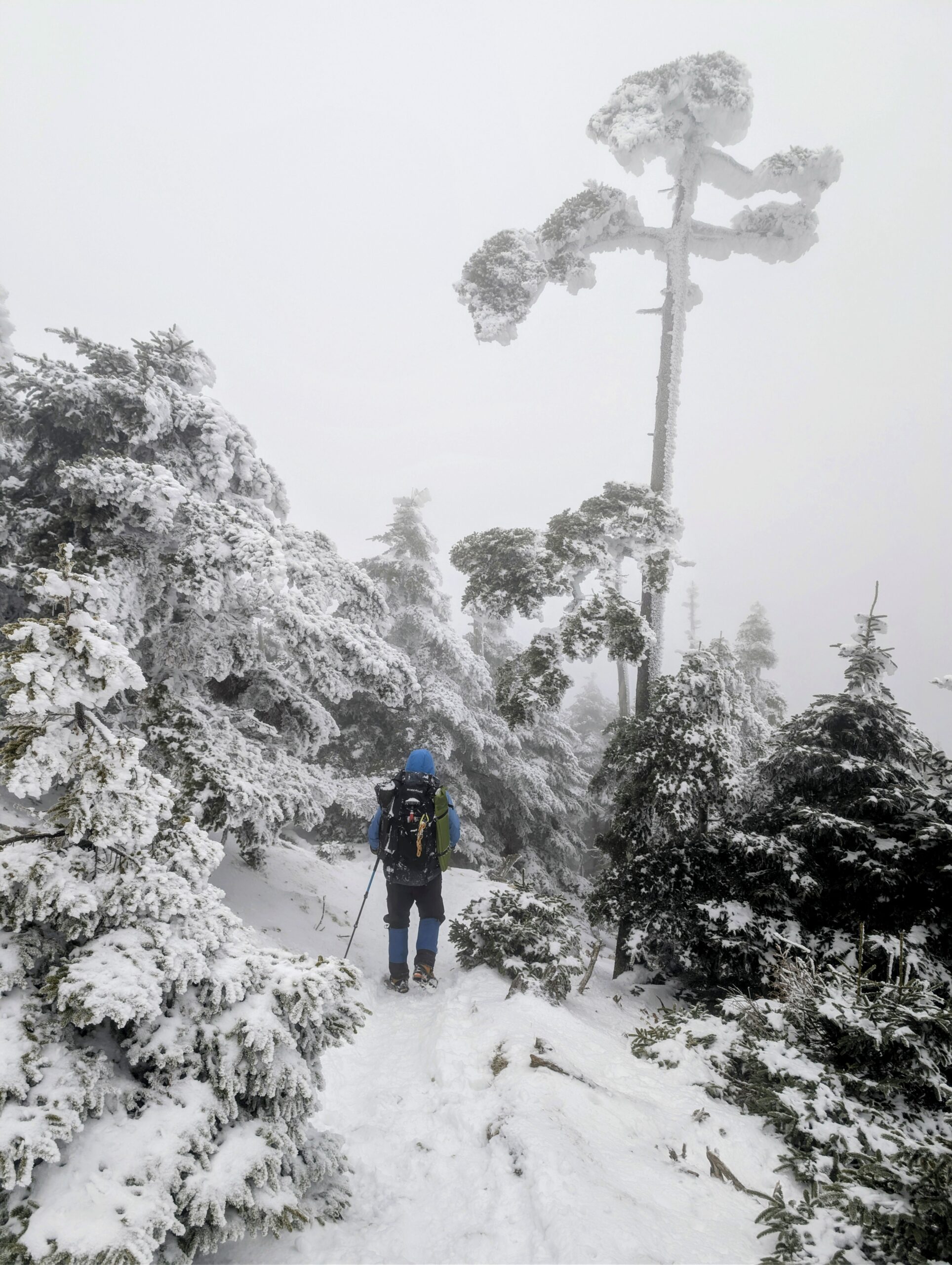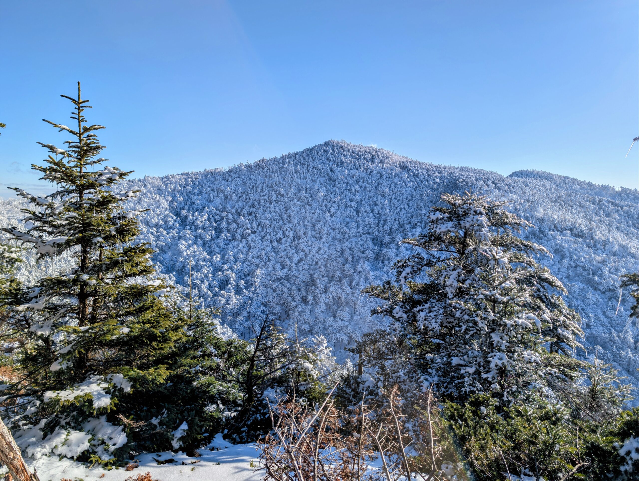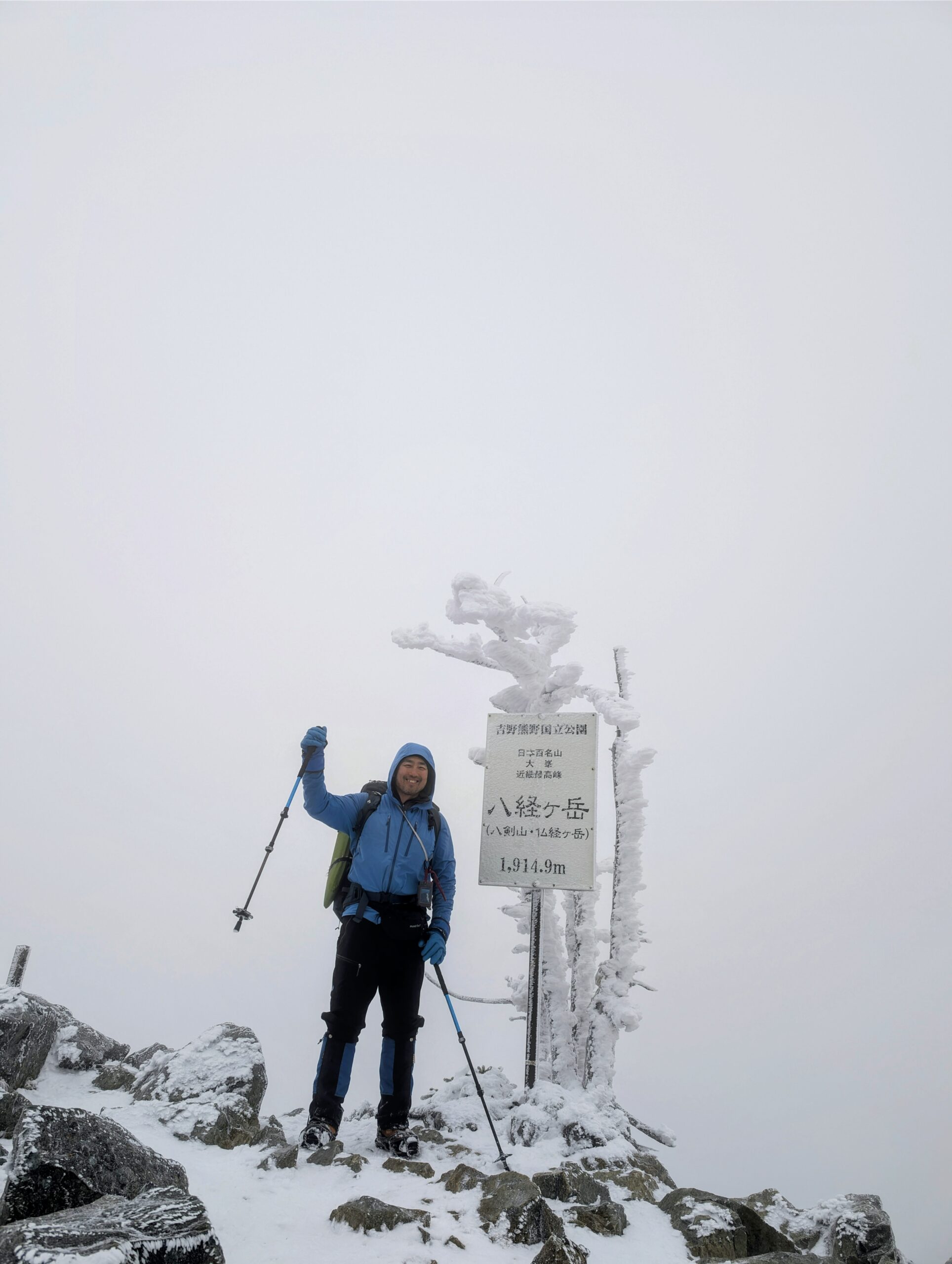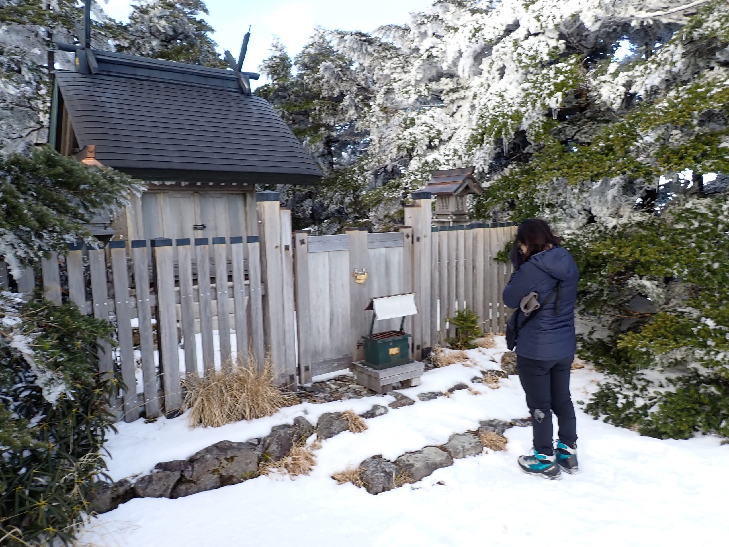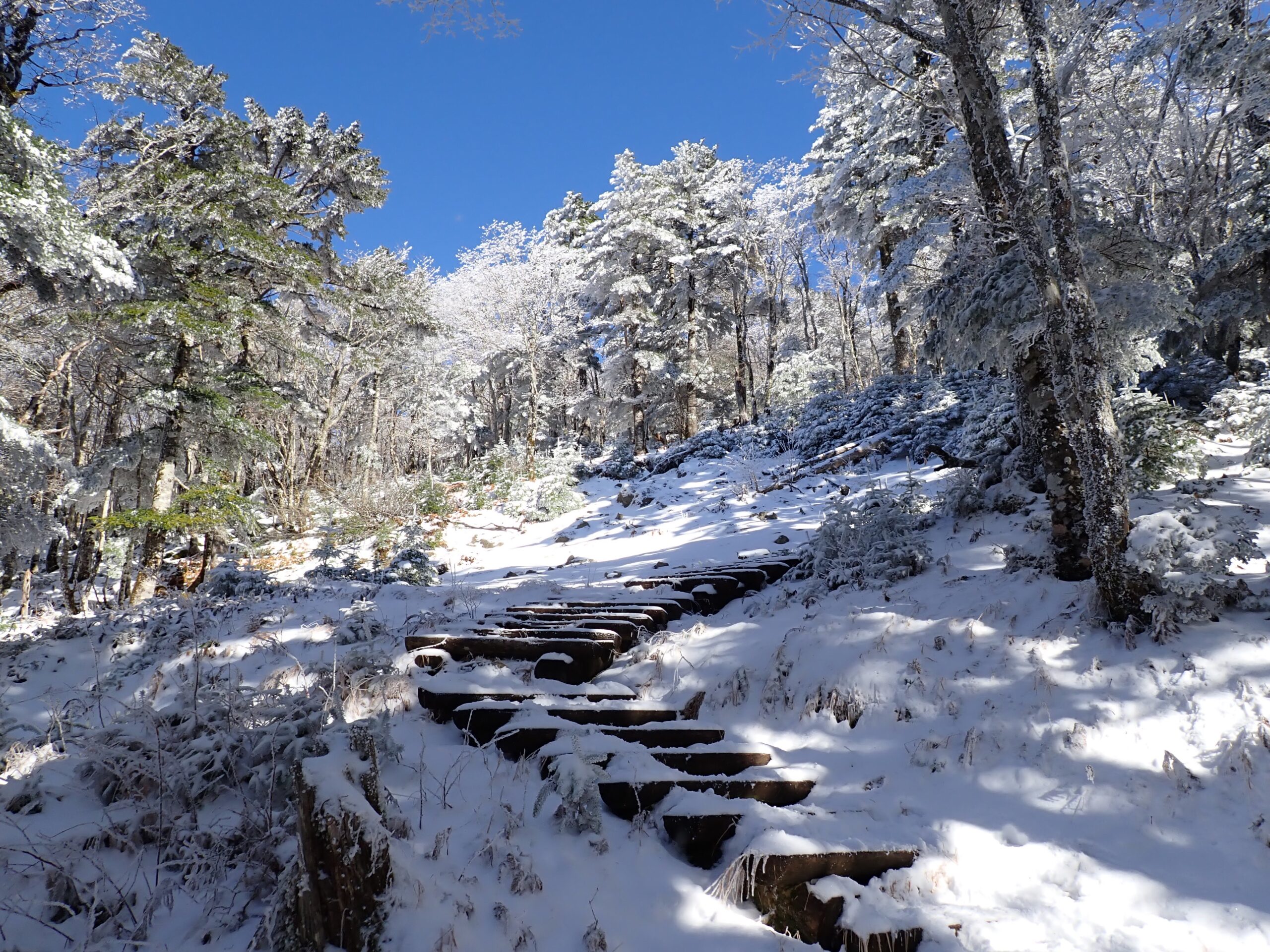 ここで泊まれば水の心配はいらないけれど、今日のこの天気を逃すのはもったいないということで、今日の夜と明日の分の水を歩荷して弥山小屋を目指す。雪は少なく、木道も使えたので、水でザックは重くなったがほぼほぼコースタイムで弥山に到着。右手に広がる八経ヶ岳の斜面は霧氷の森になっている。ここまで来てよかった。