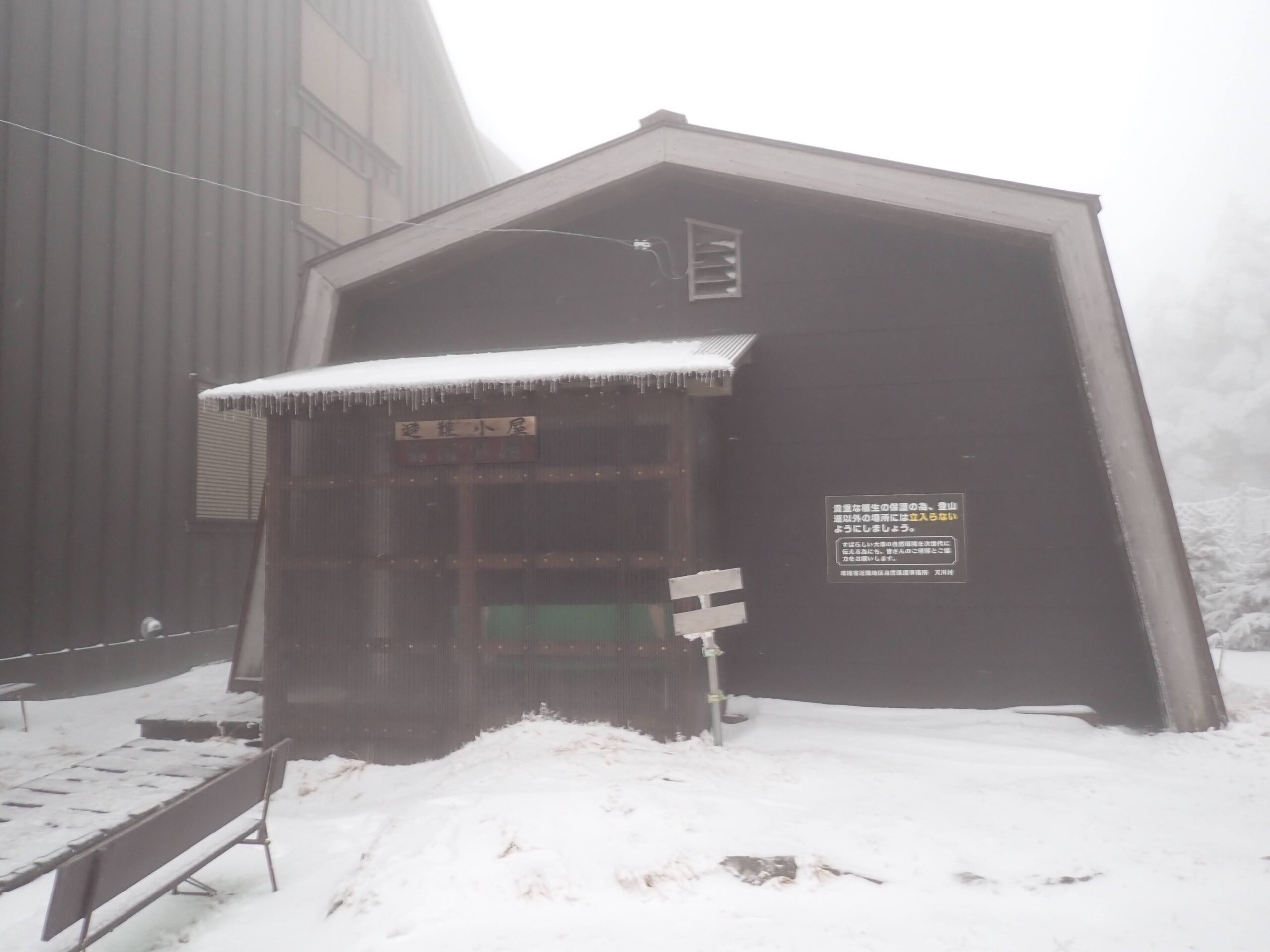 弥山小屋の冬季小屋には先着3名がいたので、交渉して奥のスペースを確保。すみすみが外のテーブルでお茶したいというので出てみたが、寒くてお湯が直ぐに冷めてしまうので早々に小屋に戻る(夏山じゃないんだから)。小屋も底冷えがして寒いので、非常用にもってきたテントを小屋の中に張って暖をとると人心地ついてきた。